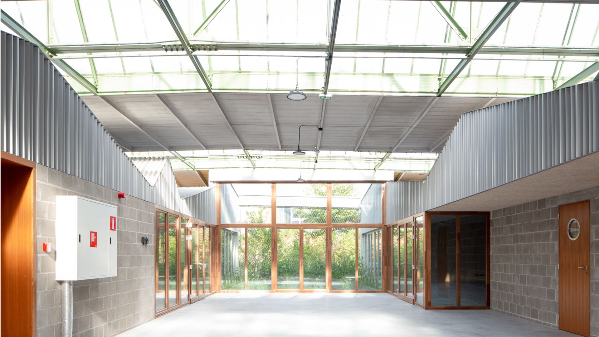 L'acier joue un rôle central : les nouvelles constructions s'appuient sur une structure métallique légère, offrant flexibilité d'aménagement et possibilité de démontage futur. Les façades en blocs de béton et les toitures en tôle d'acier nervurée, de teinte aluminium naturel, s'harmonisent avec le caractère industriel du site. Les matériaux d’origine sont réemployés, les démolitions valorisées, et les gravats recyclés. L'acier galvanisé est également utilisé pour les garde-corps et grilles, apportant transparence et sécurité. Un auvent en inox en façade rue signale le nouvel équipement. Un patio végétalisé et une 'rue intérieure' relient les espaces, apportant lumière et ouverture vers le parc.