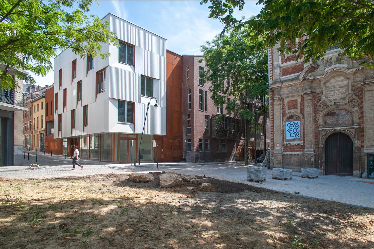 Situé en plein dans le quartier historique des Marolles, au cœur de la capitale, le projet Notre Seigneur, conçu par le bureau bruxellois B612architectes, rassemble plusieurs fonctions dans un complexe sobre et moderne, caractérisé par son enveloppe associant acier corten et tôle déployée. Le bâtiment constitue, au vu du terrain en angle exigu, une réelle performance architecturale, valorisant l’espace public aux alentours et intégrant une couverture végétale maximale.