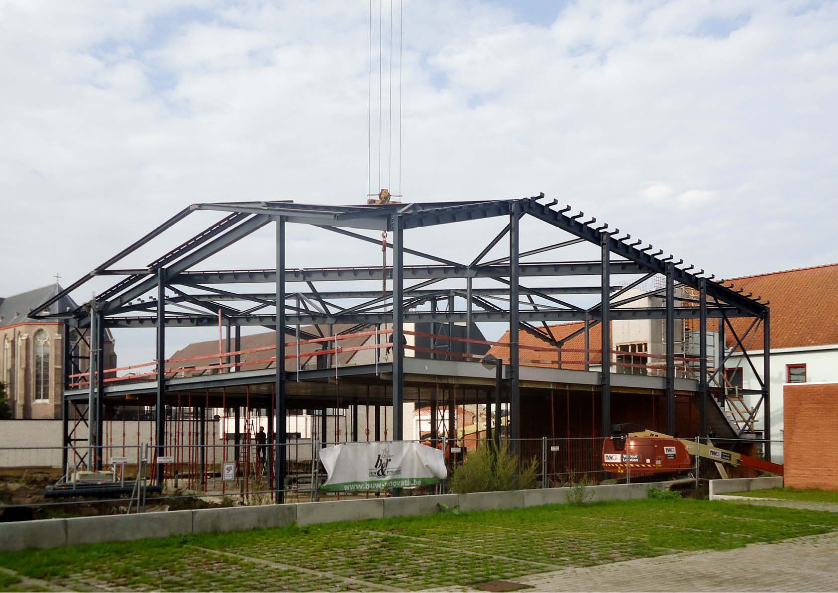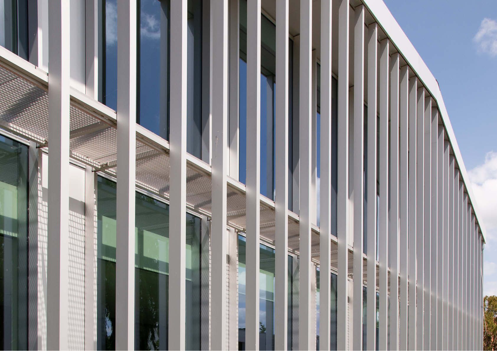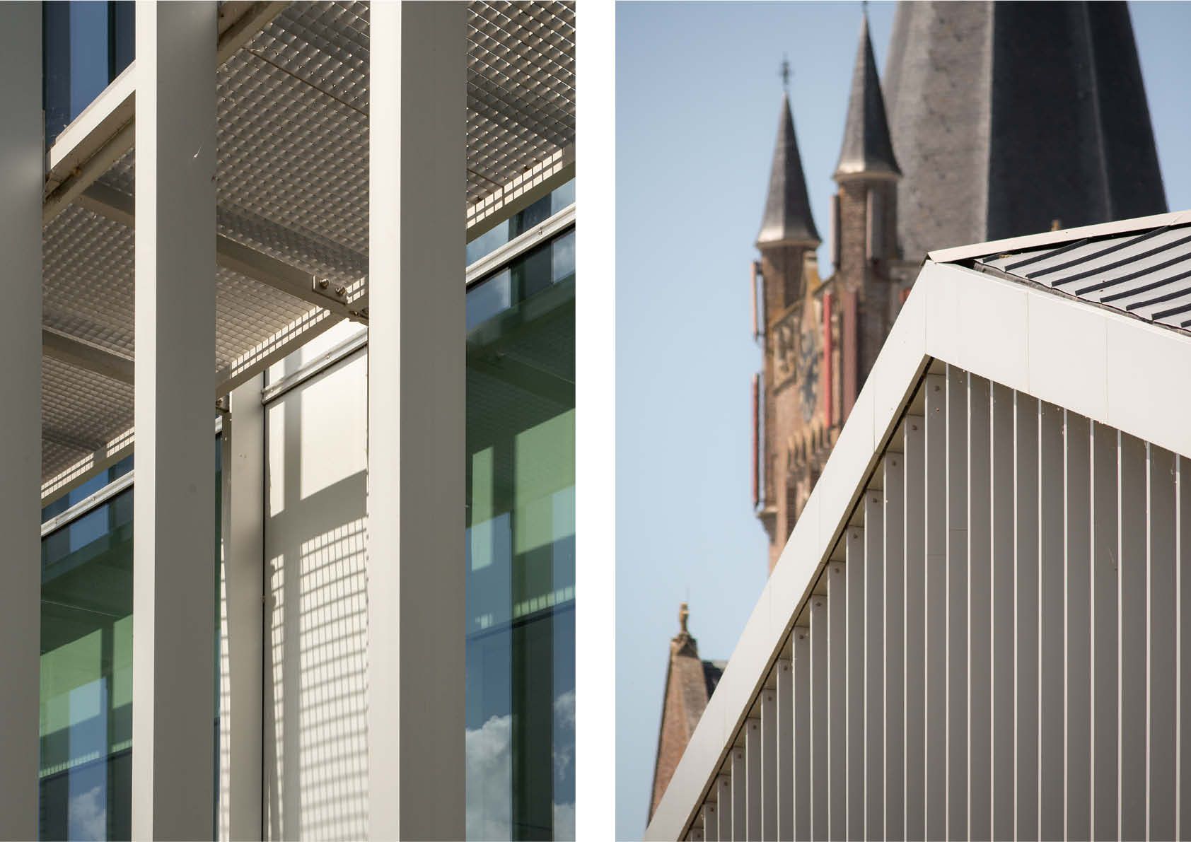 De nieuwbouw springt niet alleen in het oog door zijn imposante vliesgevels maar ook door het markante driedimensionale dak dat uit een aaneenschakeling van hellende vlakken bestaat. De draagstructuur is grotendeels opgebouwd uit een gebout staalskelet van kolommen en liggers, geschoord tegen windkruisen in de gevel. De draagvloeren bestaan uit voorgespannen betongewelven en het dak uit geprofileerde staalplaten.